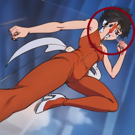 "ADetailer"のプロンプトに顔のプロンプトを入れない場合、顔の中で人が飛び蹴りをする様子を描こうとする。