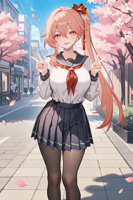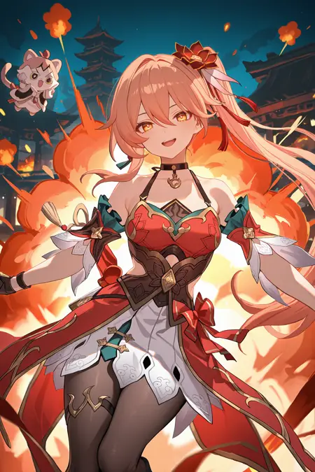 デフォルト衣装用の追加プロンプト: サイドポニーテール、髪の花、黒手袋、茶色のタイツ、ハルタードレス、ペンダントチョーカー、取り外し可能な袖、太ももストラップ、アンクルブーツ