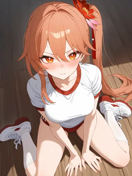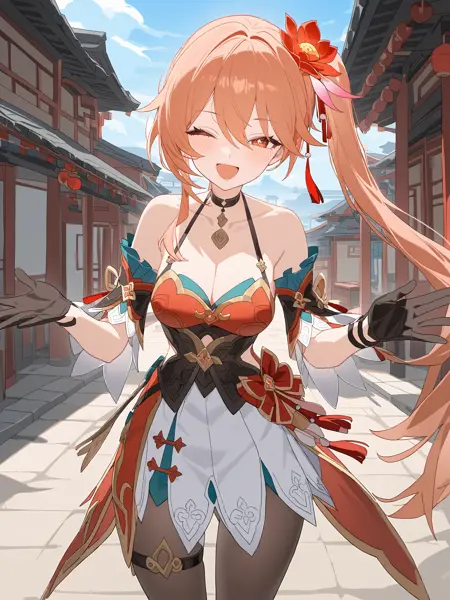 デフォルト衣装用の追加プロンプト: サイドポニーテール、髪の花、黒手袋、茶色のタイツ、ハルタードレス、ペンダントチョーカー、取り外し可能な袖、太ももストラップ、アンクルブーツ