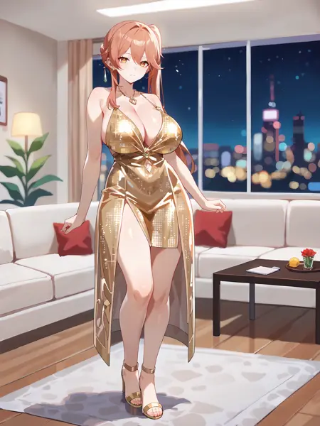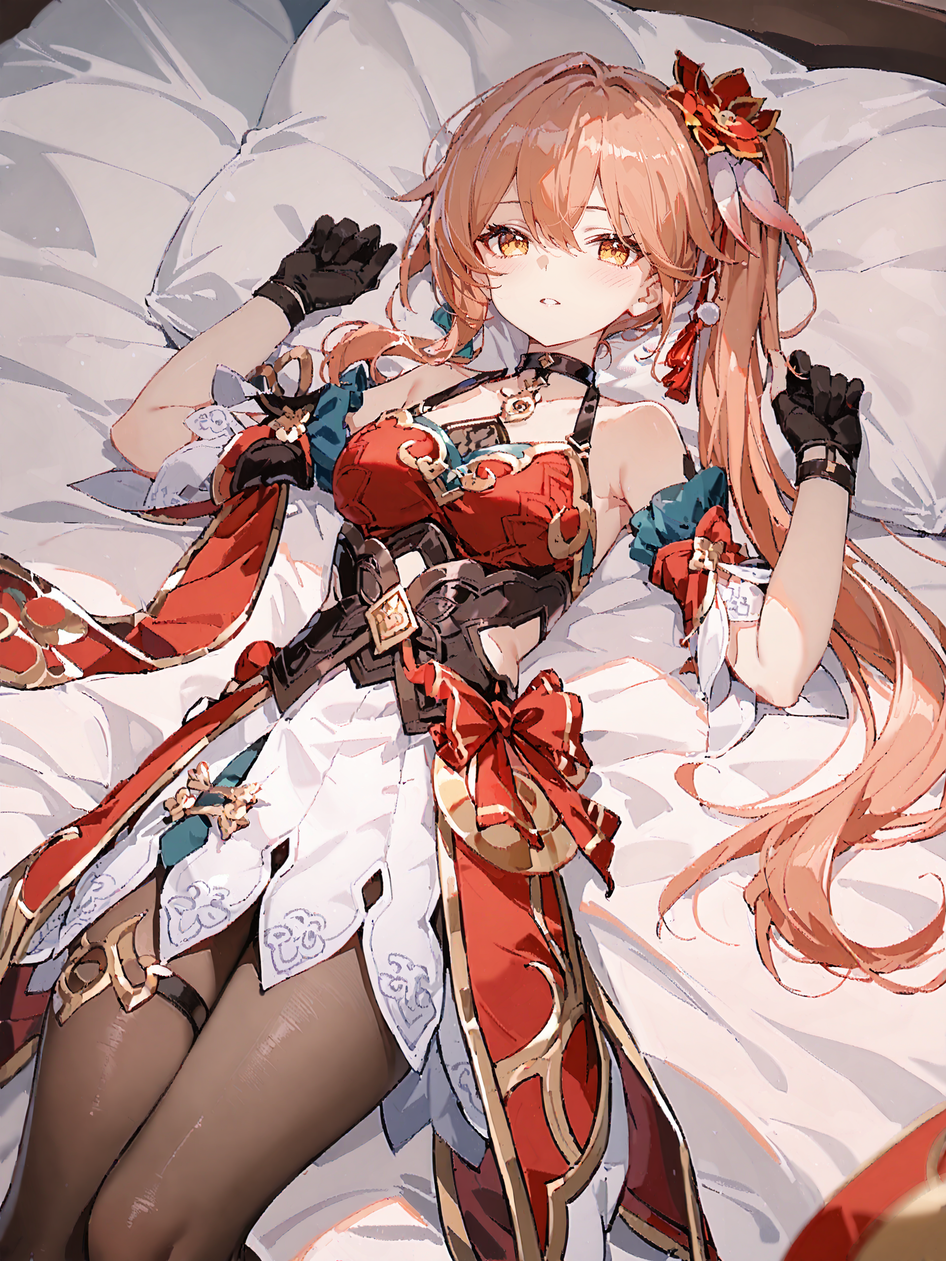 Additional prompts for the default costume: side ponytail, hair flower, black gloves, brown pantyhose, halter dress, pendant choker, detached sleeves, thigh strap, ankle boots