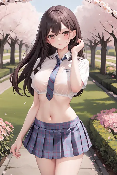 low_cut_school_uniform, plaid skirt, necktie, navel