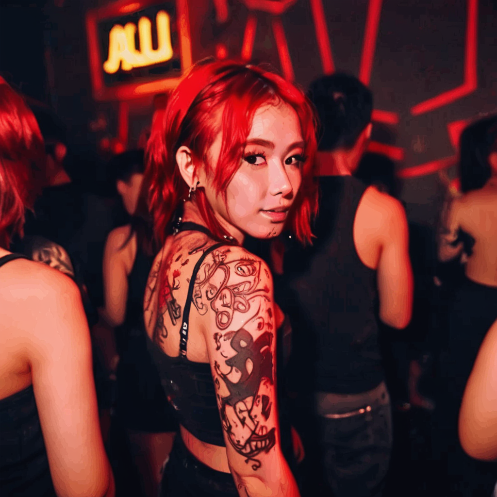 Common reference word: Bar photo, hair, jewelry, multiple girls, necklace, shorts, bra, earrings, nail polish, many people,glasses, jacket, round eyewear,skirt, etc. describe the character, or describe the depth of field, blurry background, blurry foreground, red background,red light,