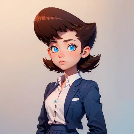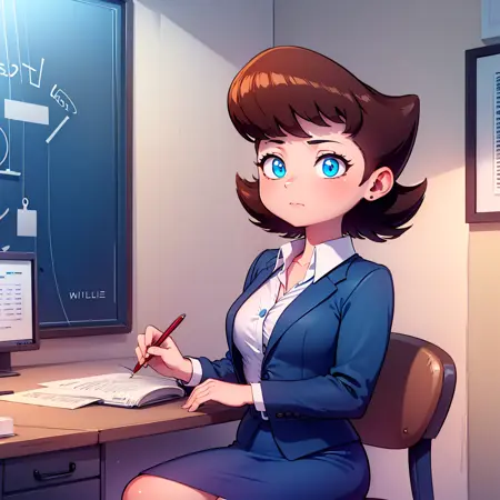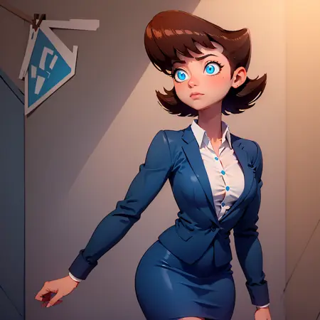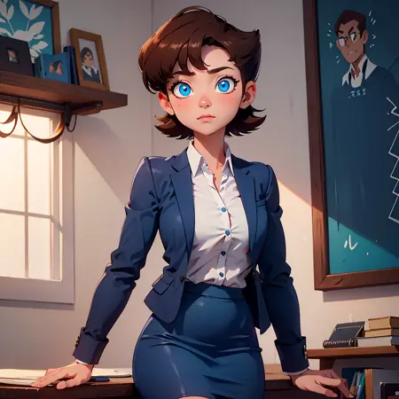 1girl, Lila test, formal, suit, jacket, blue skirt, pencil skirt , blue eyes, brown hair, white shirt, short hair,