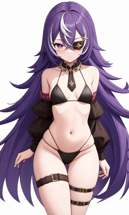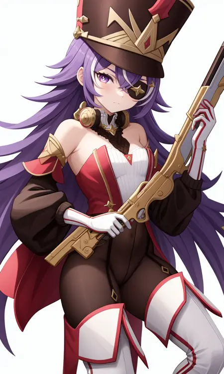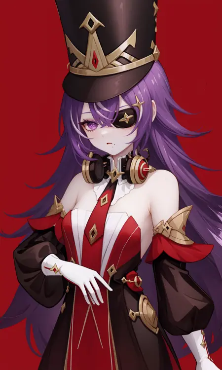 Trigger:chevreuse, long hair, purple hair, purple eyes, hat, eyepatch, gloves, white gloves, bangs, hair between eyes, detached sleeves