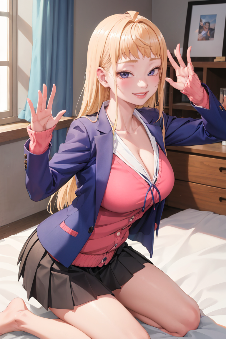 FuyukiMinami, blue jacket, pink cardigan, cleavage, red scarf, grey skirt
