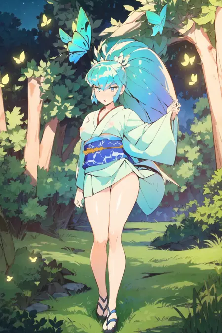 프롬프트: 최고의 품질, 1명의 여성, 아름다운 얼굴, 긴 파란 털, 앞머리, 뒤트는 머리, 한복, 허리띠, 우루세이 야츠라, 오유키.