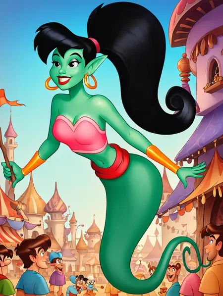 eden,pointy ears,green skin,colored skin,black hair,high ponytail,