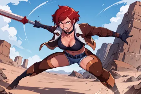 • トリガー: 1girl、ショートヘア、ジャケット、手袋、チョーカー、ショートパンツ、シンクスタッキング、ロングスリーブ、ハイヒールブーツ、クロップトップ、weapon、sword、ベルト