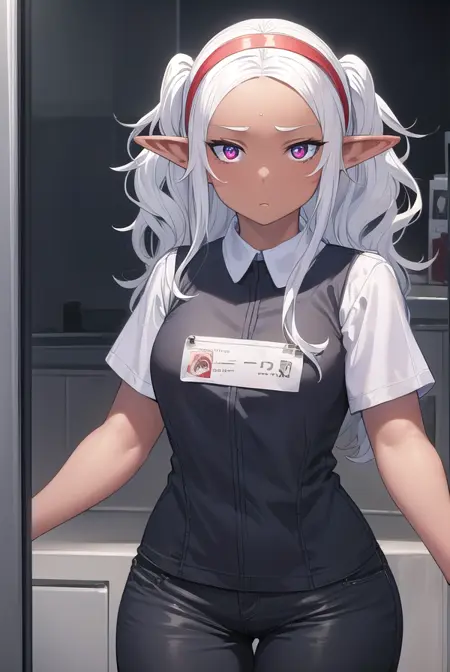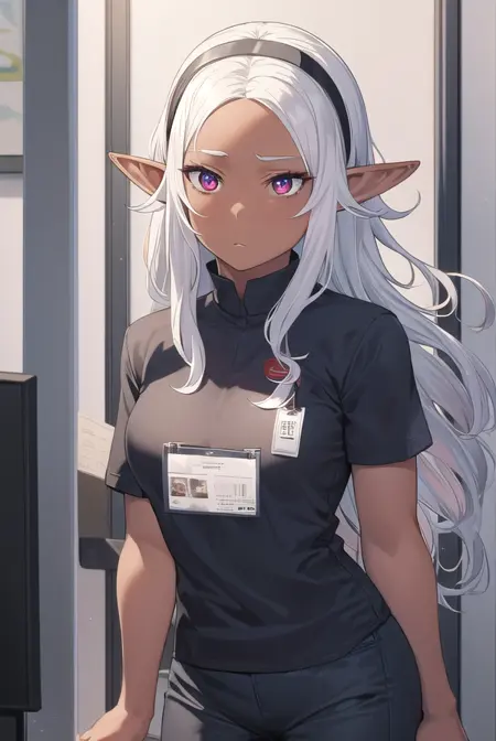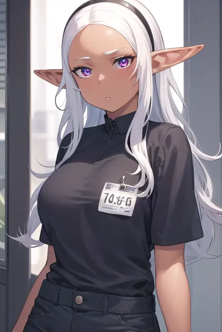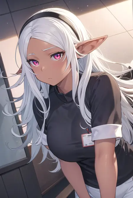 kuroeda、長い髪、ヘアバンド、黒肌、黒肌の女性、白髪、(赤い目:1.3)、(額:1.2)、エルフ、とがった耳、