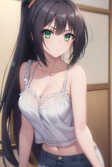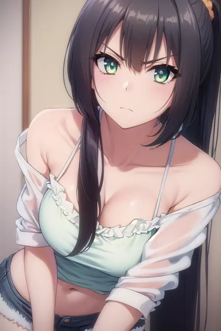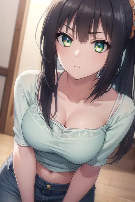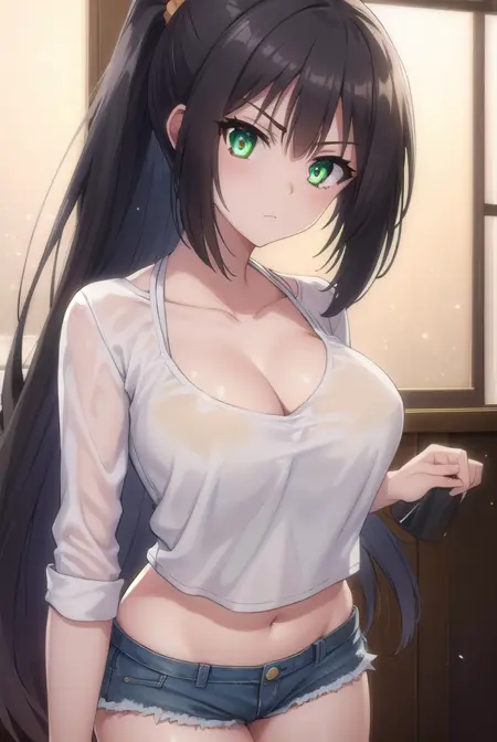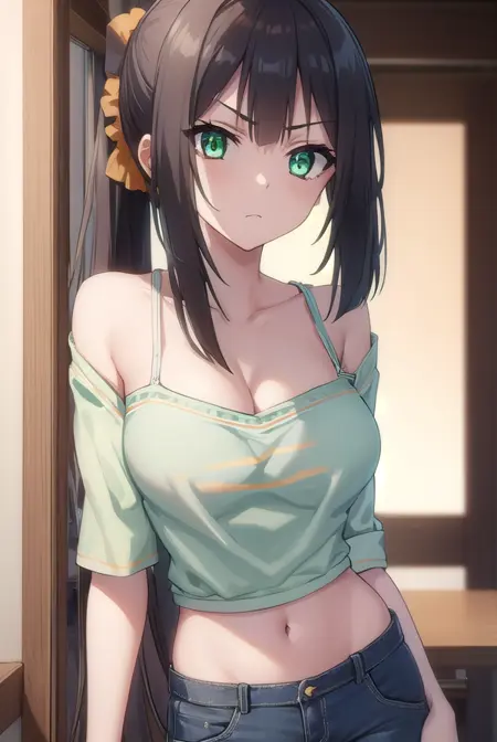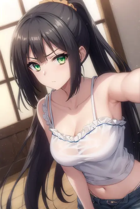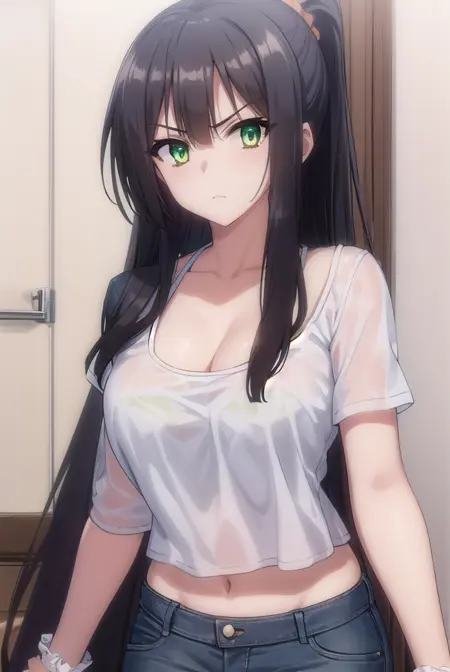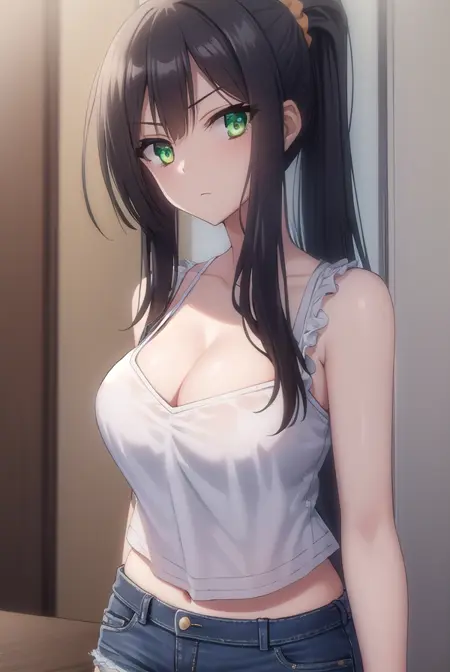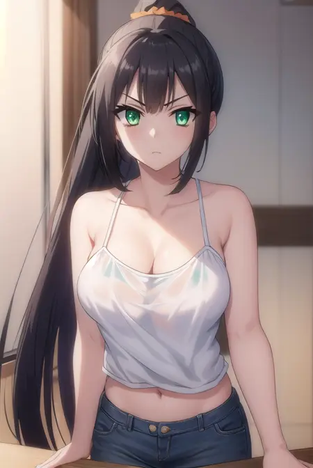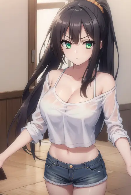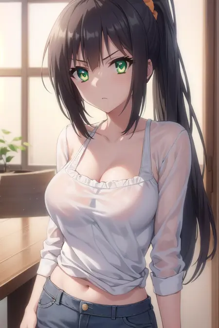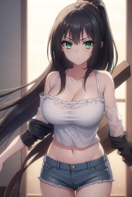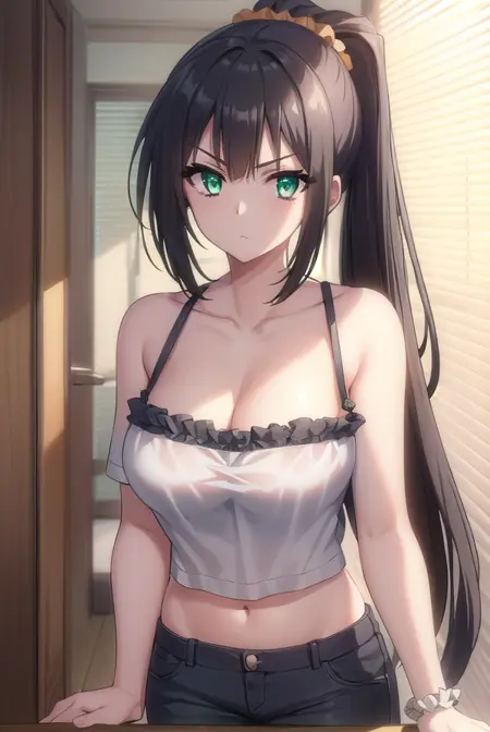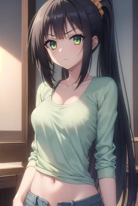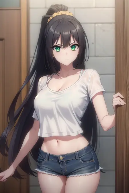 seraphim, long hair, black hair, very long hair, (green eyes:1.3), ponytail, scrunchie, orange scrunchie,
