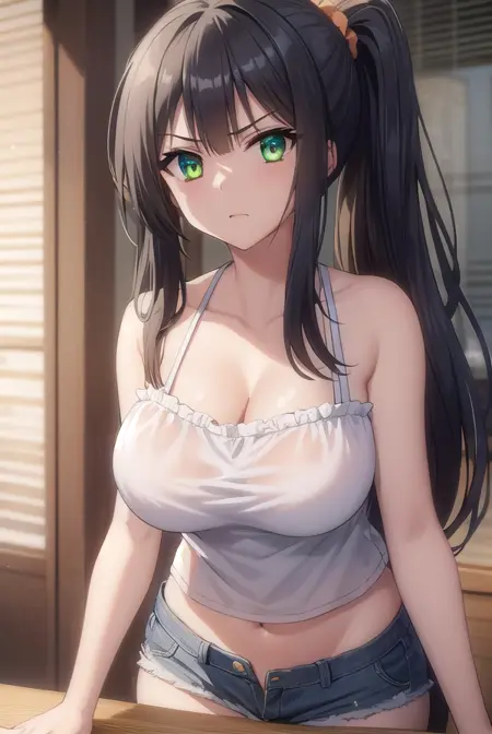 へそ、胸元、腹部、キャミソール、ショートパンツ、デニム、