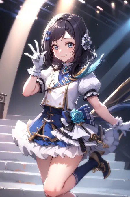 • Original outfit : aiba uiha, uiha default, medium hair, braided bangs, hair bow, idol clothes, white jacket, blue skirt, frills, puffy short sleeves, white gloves, socks