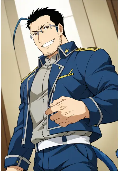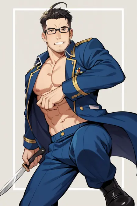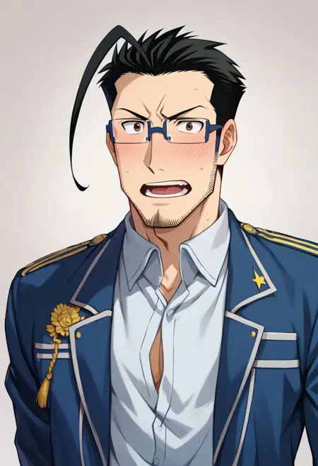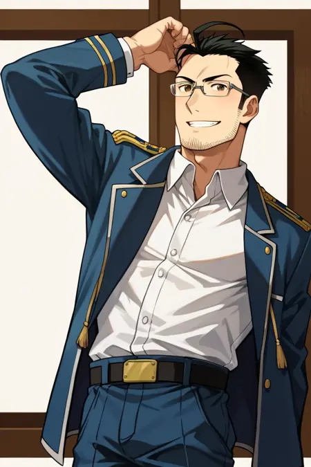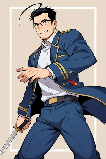 프롬프트: 마스 휴즈, 검은 머리, 아호게, 측면 수염, 안면 수염, 턱선 수염, 턱 수염, 사각 안경, 아메스트리스 국군 복장 (풀메탈 알케미스트), 닫힌 재킷, 단추 단 재킷, 파란 재킷 (풀메탈 알케미스트), 긴 소매 재킷, 단축 재킷, 파란 바지, 아메스트리스 파란 엉덩이 망토 (풀메탈 알케미스트), 흰 허리띠, 파란 바지, 검은 부츠