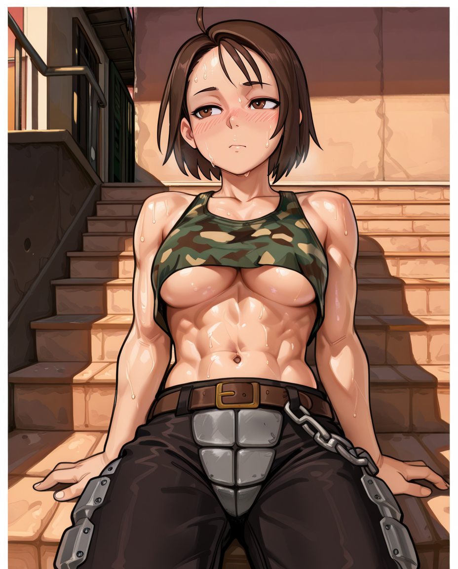 카모 셔츠, 어깨 노출, 벨트, 가죽 바지, - 빨간 장갑, 부츠,