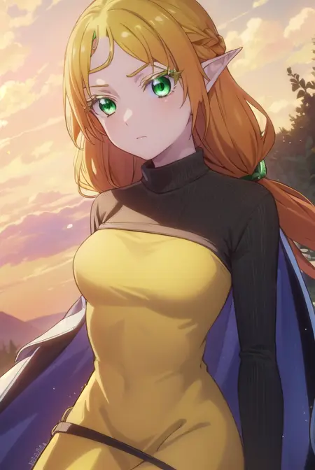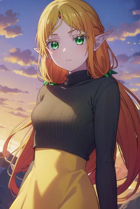 tsundere elf, long hair, blonde hair, (green eyes:1.3), pointy ears, elf, multicolored hair, forehead jewel,
