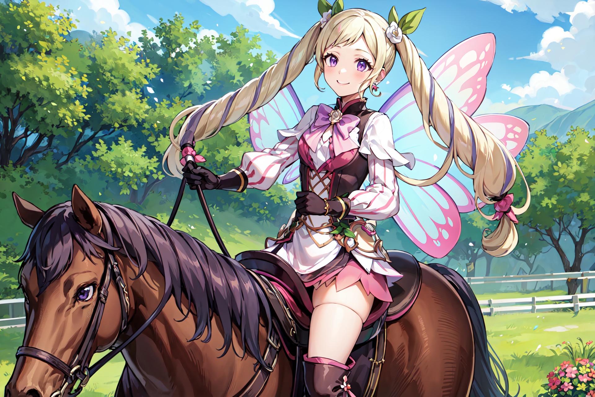 【화려한 옷차림】: res_elise, 요정 날개, 분홍색 짧은 드레스, 그라데이션 의상, 볼륨 있는 긴 소매, 꽃, 보석, 계층적인 치마, 젯타이 료이키, 귀걸이, 허벅지 양말, 무릎 부츠, 갈색 장갑, 넥타이, 식물
