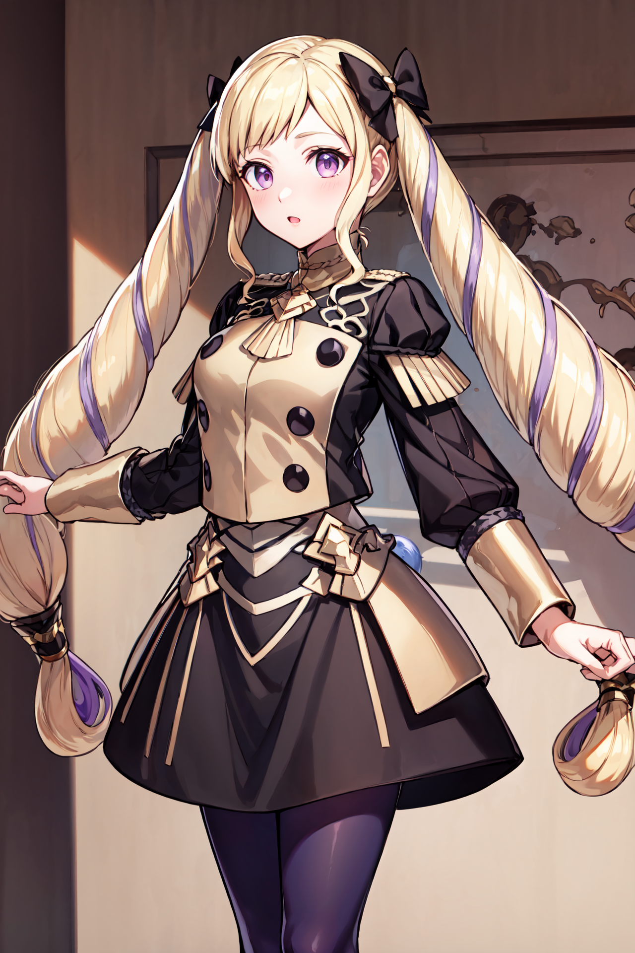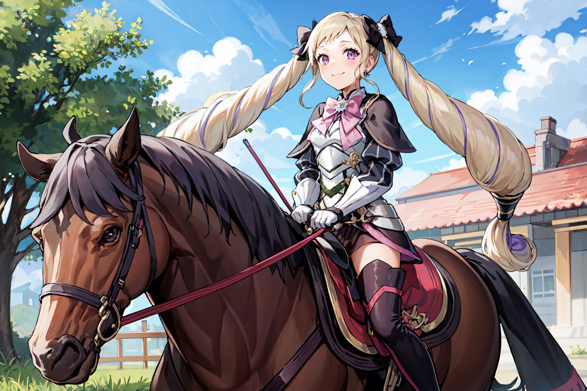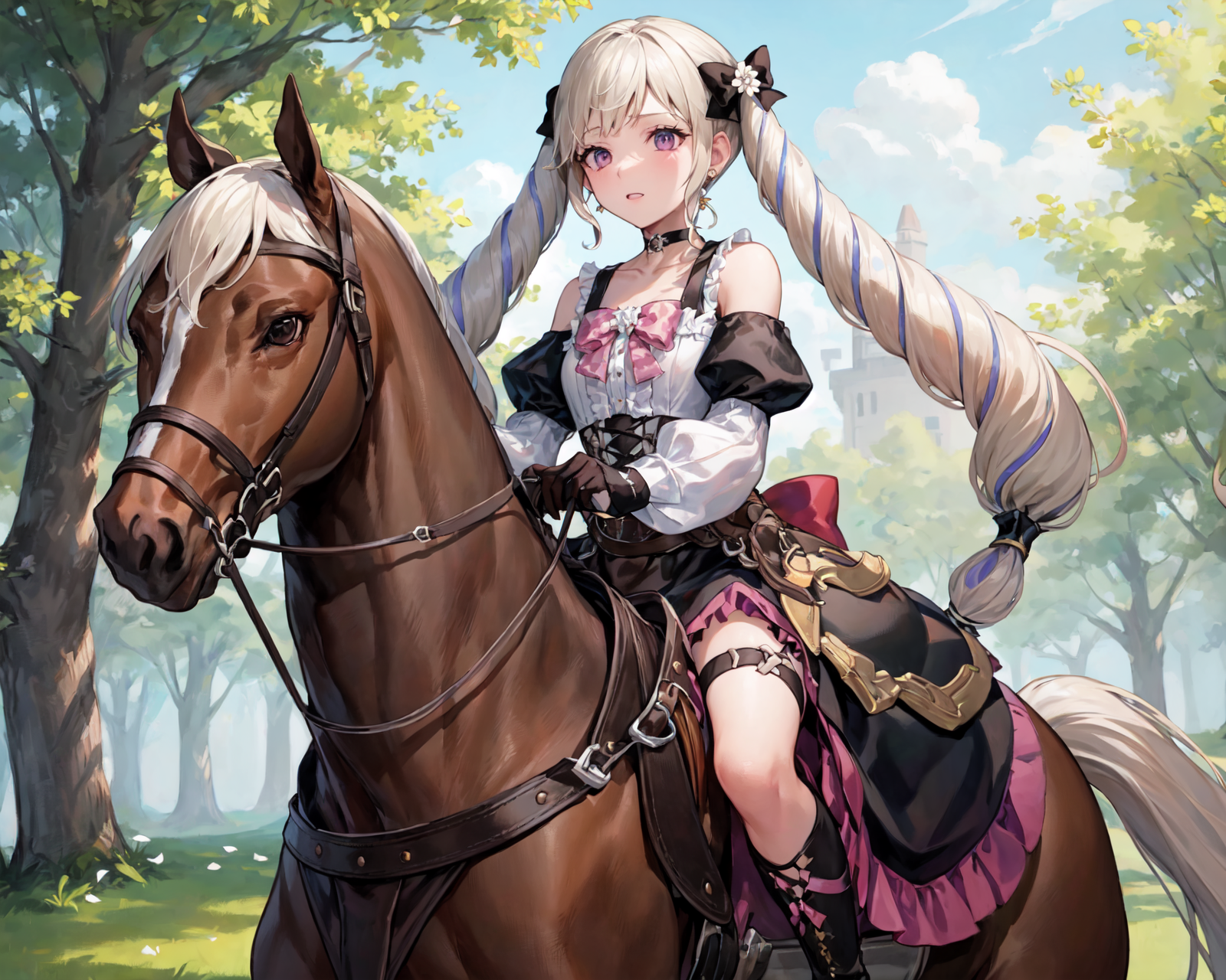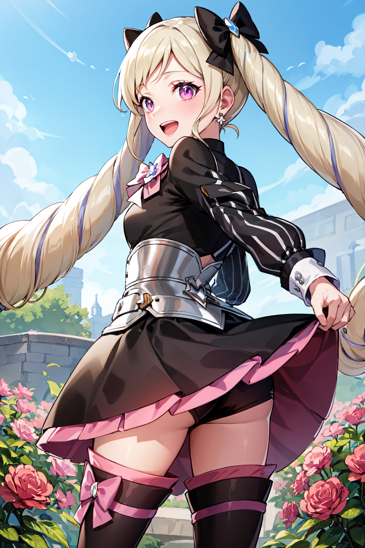 【기본 옷차림】: def_elise, 허벅지 부츠, 허벅지 양말, 하이힐 부츠, 젯타이 료이키, 보석, 긴 소매, 검은 짧은 드레스, 분홍색 리본, 분홍색 넥타이, 가슴판