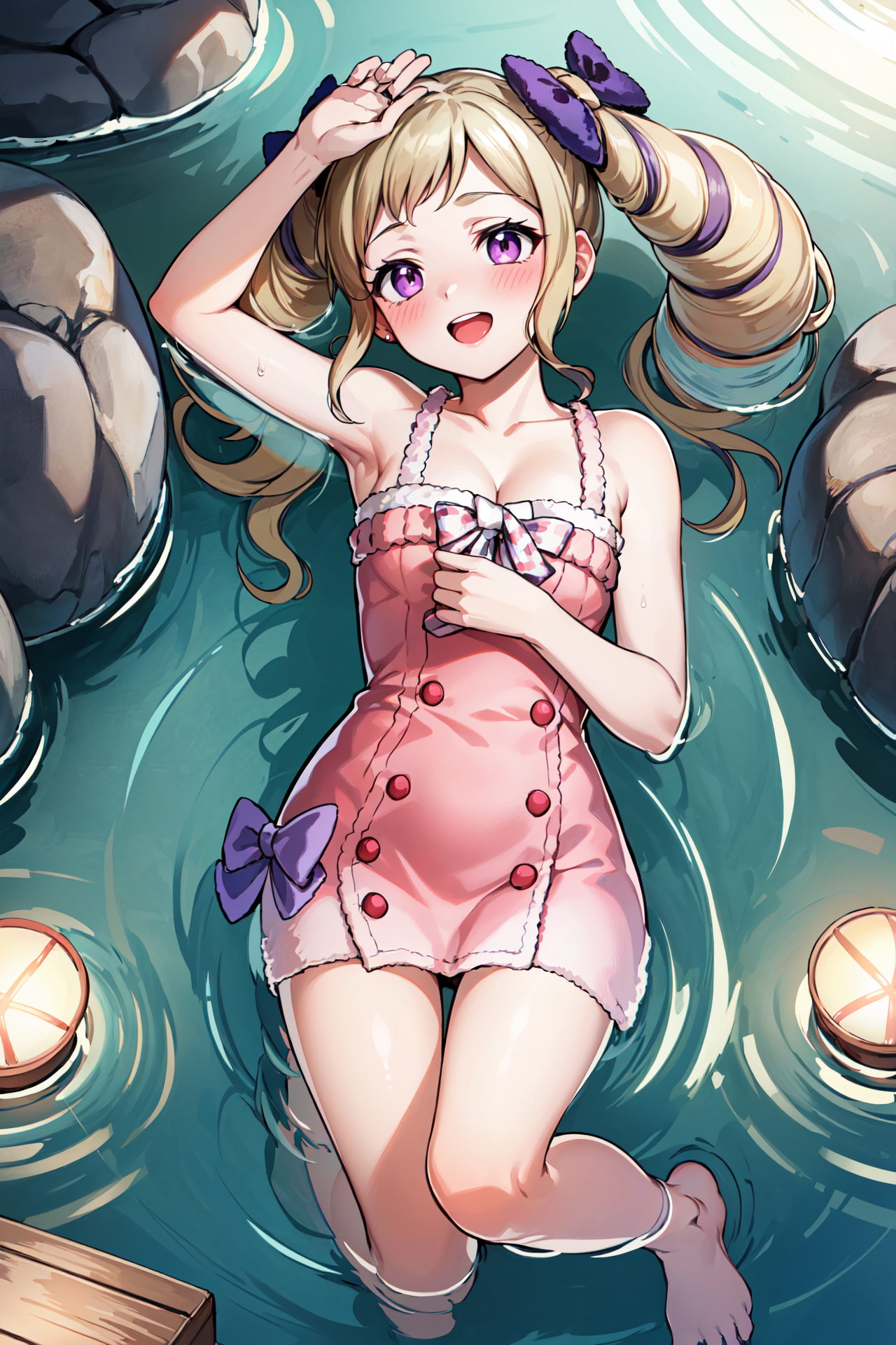 【호시다인 여름 옷차림】: hos_elise, 맨발, 작은 가슴, 리본, 짧은 드레스, 가슴 노출, 단추, 수건