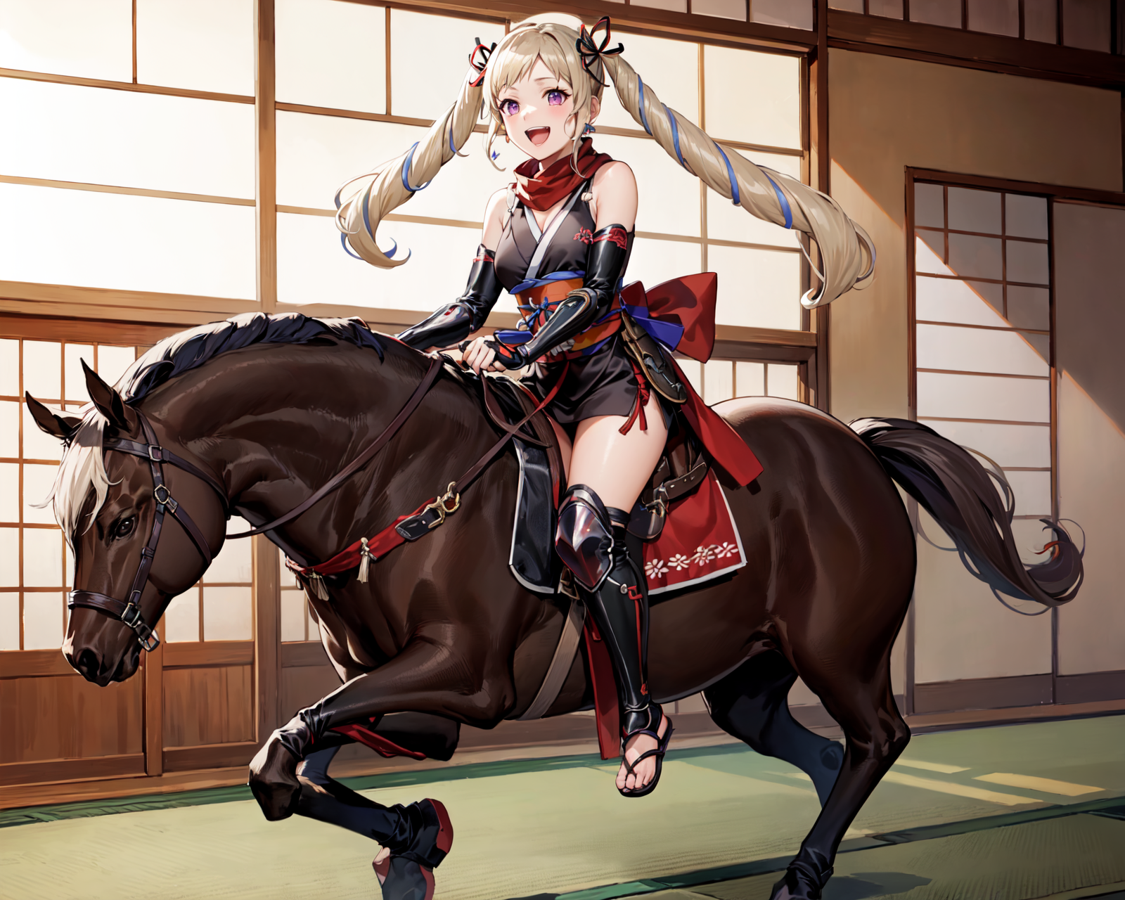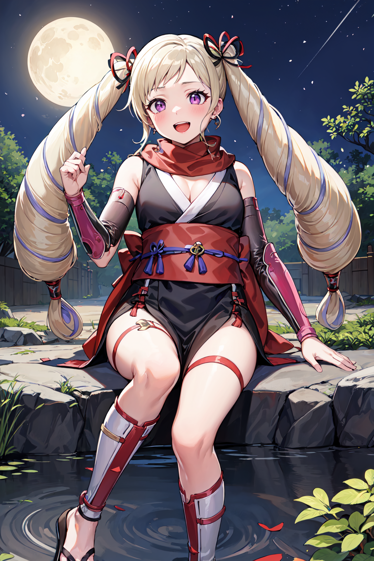 【닌자 옷차림】: nin_elise, 더블 테일, 검은 일본 복장, 귀걸이, 띠, 어깨 노출, 골반 커튼, 허벅지 보호대, 붉은 오비, 리본, 붉은 스카프, 팔 보호대, 가슴 노출, 허벅지 스트랩, 허벅지, 검은 짧은 기모노, 발가락이 드러나는 신발, 조리