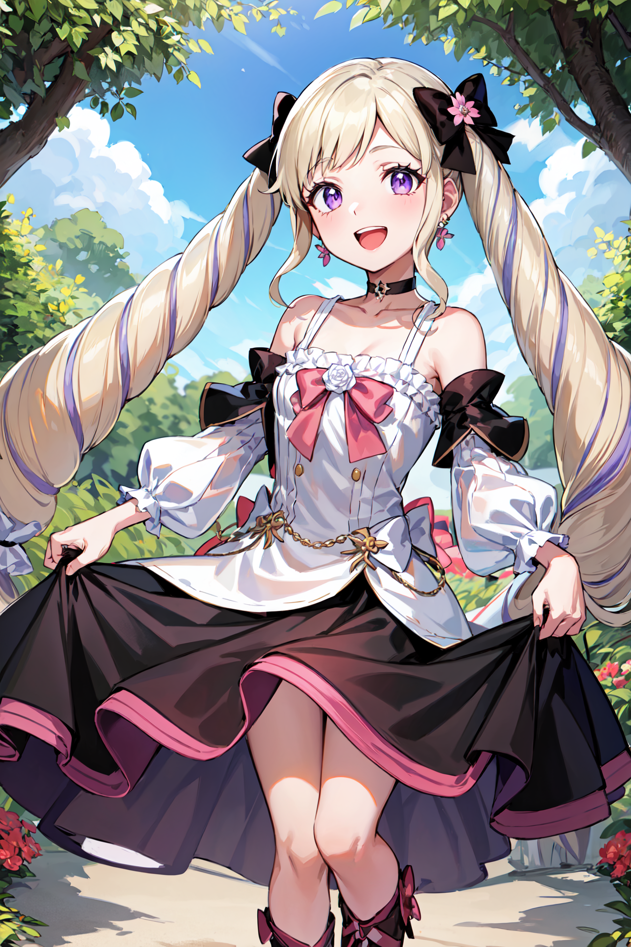 【발렌타인 옷차림】: val_elise, 리본, 검은 하이힐 부츠, 소매 없는 흰 드레스, 검은 치마, 분리된 긴 소매, 프릴, 어깨 노출, 빗장뼈, 드레스 꽃, 검은 초커, 볼륨 있는 소매, 다리 리본, 검은 치마, 귀걸이, 보석