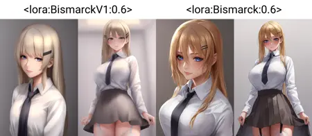 이 loRA에서 제가 지적할 수 있는 유일한 문제는, 사용 강도에 상관없이 비스마르크가 갈색 머리로 변할 수 있으며, 눈 색이 파란색에서 빨간색으로 바뀌는 사소한 문제입니다.