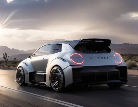 车尾部分,车顶行李架平滑过渡至一个大型尾翼,该尾翼从C柱附近的一条垂直线延伸而出,增强下压力。尽管尾翼体积庞大,但后方视野并未受阻——这是日产设计师特意避免的跑车常见问题。
