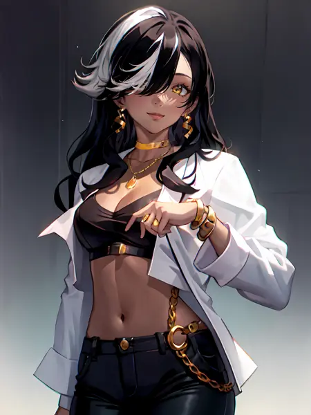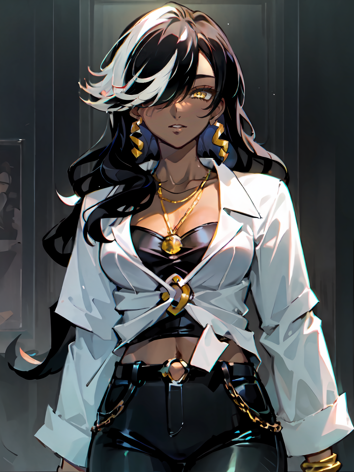 Prompts: , long hair, jewelry, dark skin, dark-skinned female, earrings, streaked hair, hair over one eye, bracelet, white hair, yellow eyes, shirt, jacket, pants, cleavage, white jacket