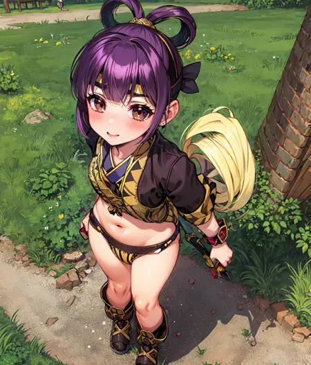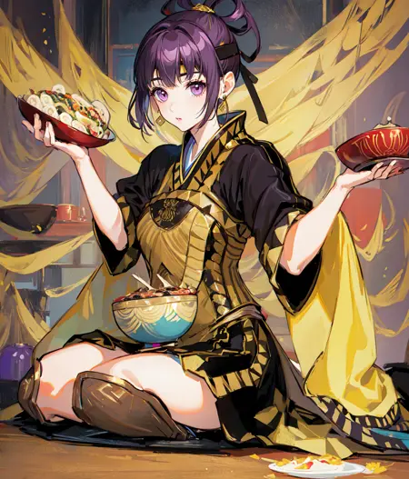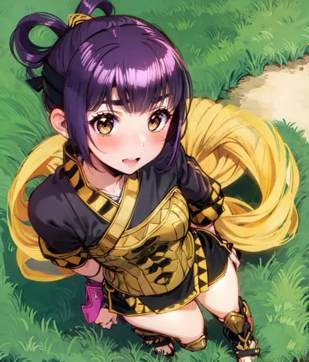 Notable tags: short hair, top knot, black and gold outfit
