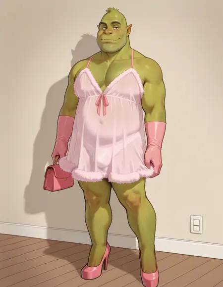 这是 fembots 穿的粉色睡衣裙(连衣裙)。它可以变成透视,也可以只是普通连衣裙。我故意未在训练中加入毛茸茸效果,以提升通用性,因此你可以自行添加 Fur 或 fuzzy 来获得粉红色毛绒效果。