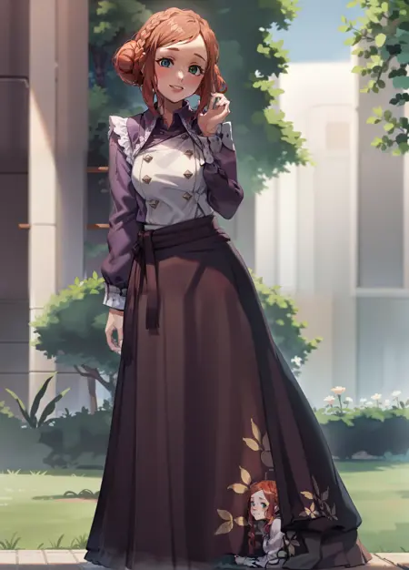 她可以穿任何你想让她穿的衣服,但如果你需要她默认的装扮,只需输入提示词:lunaze, side buns, sidelocks, dress, necklace