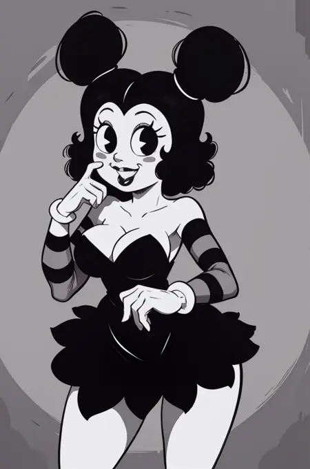 black dress, cleavage, large breasts, striped detached sleeves, - white gloves, or cartoon gloves or small white gloves, ---- - small skirt, - heels,