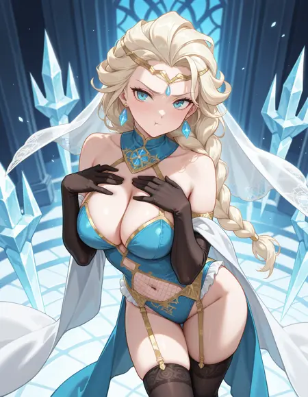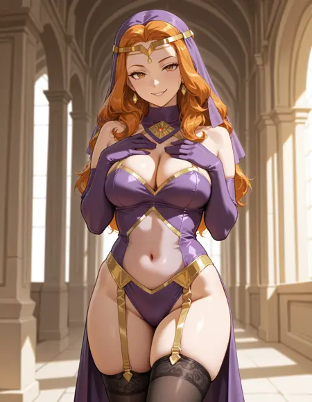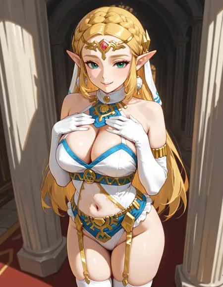 一切プロンプト不要。ストレングス.75、白いレオタードにいくつかのゼルダ要素、軽いクラウンビンディング、チョーカー、装飾的な豪華な衣装。