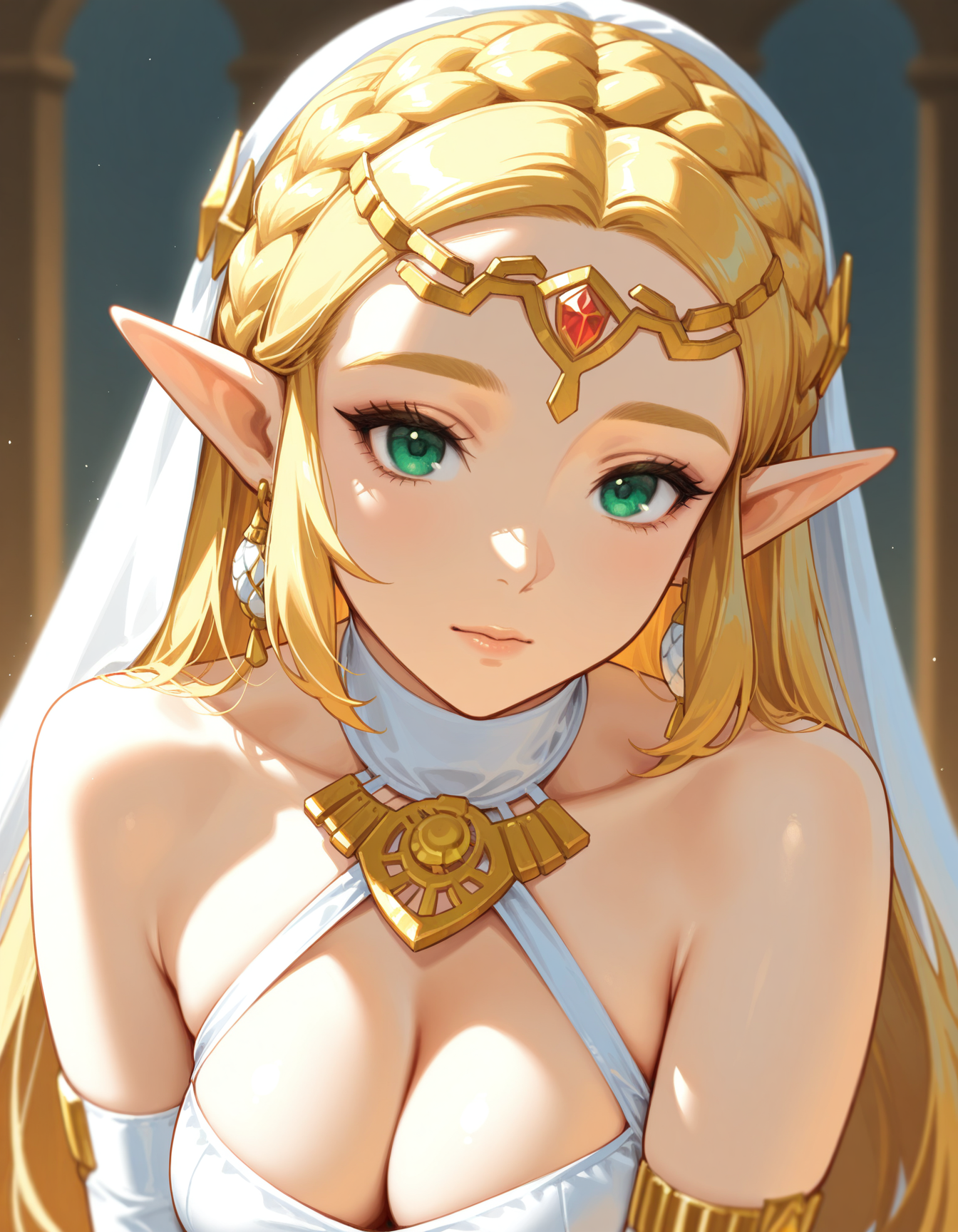 No prompting at all, .75 str, white leotard with some zelda features, light crown braid, choker, embellished ornate clothing.