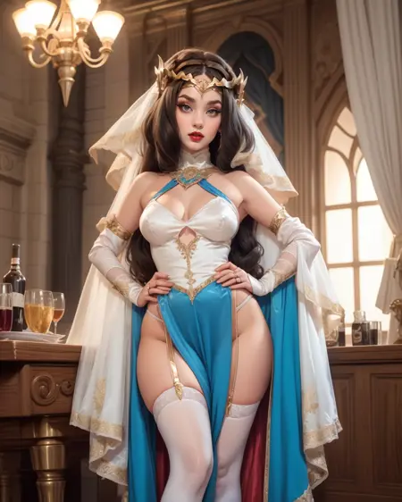 Full kit: z3ld4, circlet, white leotard, garter straps, navel, halter, clothing cutout, white thighhighs, thighs, cleavage, white gloves, elbow gloves, high heels, veil