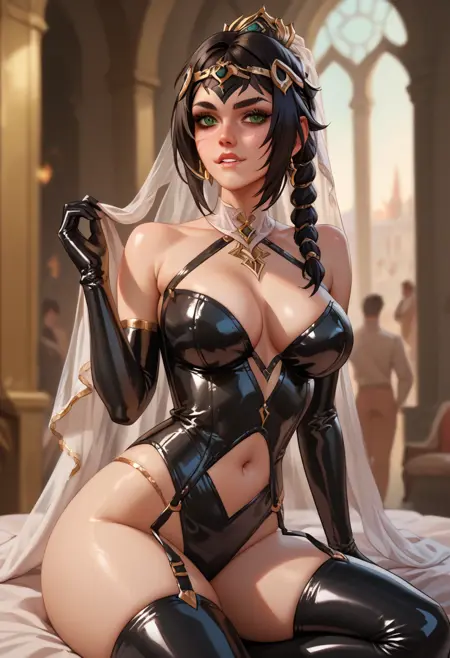 完全不需要提示词,强度 0.75,白色紧身衣带一些塞尔达元素,轻微的王冠编发,项圈,华丽装饰服饰。