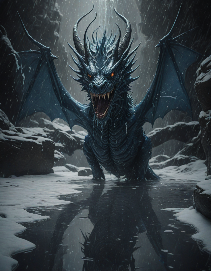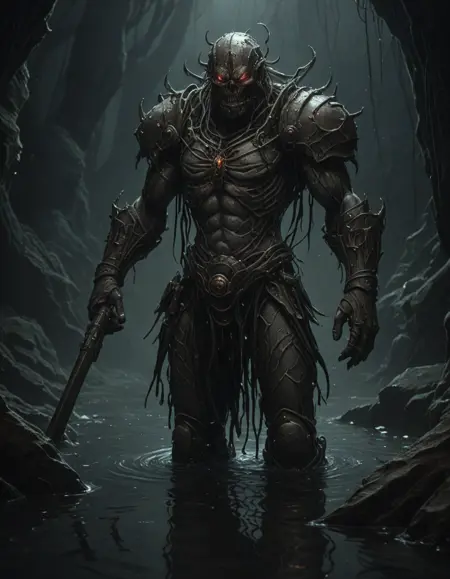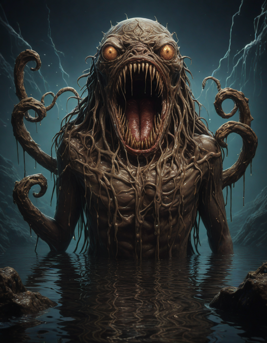 一种实验性的4个滑块合并技术,使用黑暗静水中令人不安的倒影、深海液态恶魔、高分辨率照片、坚定的雕刻面容。独特风格。示例在0.7-1强度下。