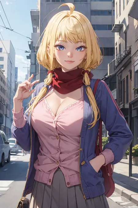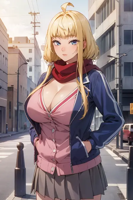 pink cardigan, cleavage, blue jacket, open jacket, red scarf, grey skirt,