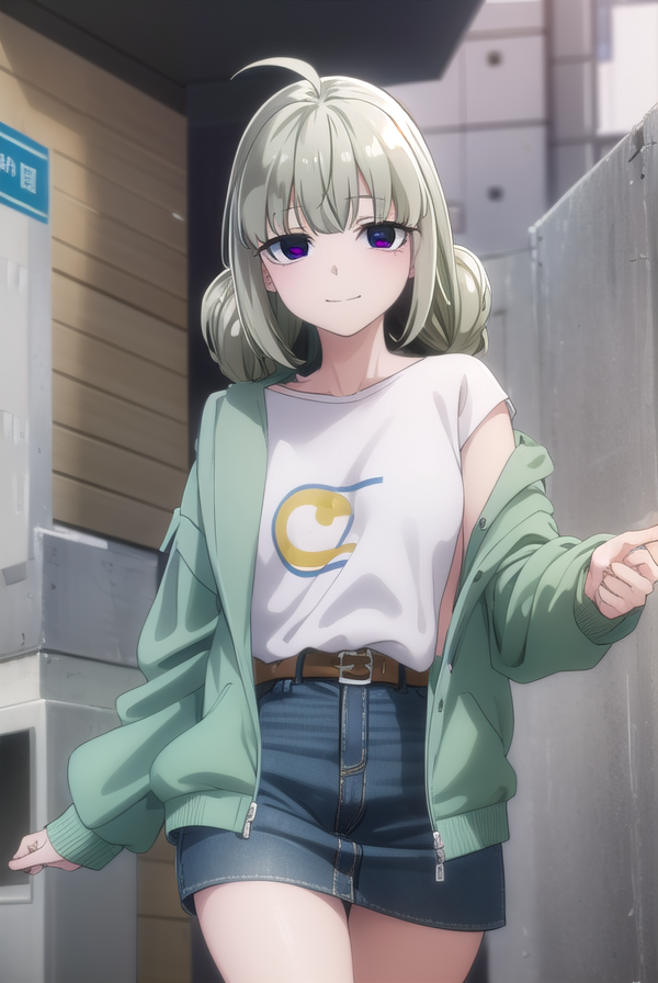 skirt, shirt, jacket, white shirt, belt, blue skirt, sleeves past wrists, shirt tucked in, (green jacket:1.2),