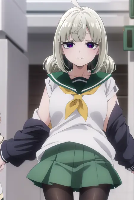 skirt, shirt, long sleeves, school uniform, white shirt, pantyhose, pleated skirt, open clothes, serafuku, miniskirt, sailor collar, off shoulder, neckerchief, sleeves past wrists, black pantyhose, cardigan, (green skirt:1.2), sleeves past fingers, yellow neckerchief, open cardigan, (green sailor collar:1.2),