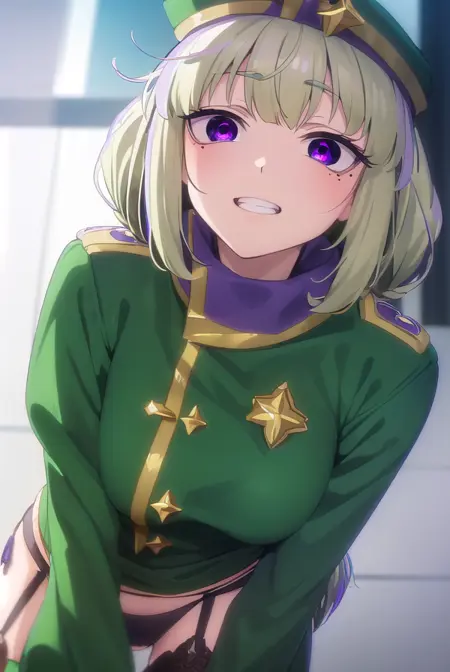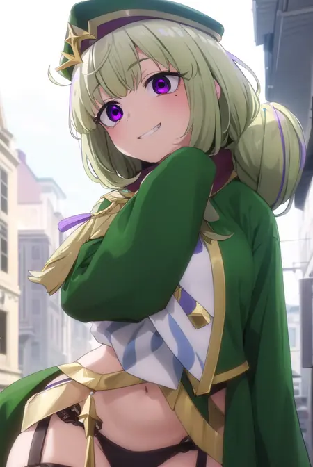 kiwi araga、前髪、あほ毛、ほくろ、目の下のほくろ、(紫の目:1.1)、緑の髪、髪の結び目、二重の髪の結び目、