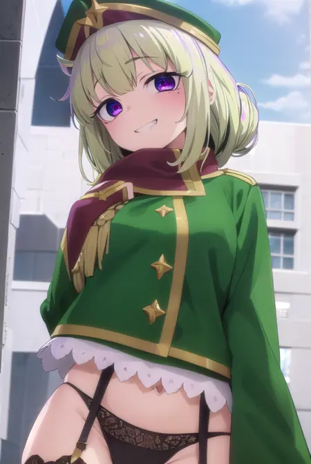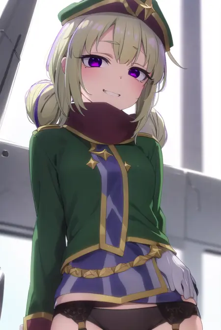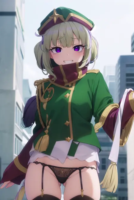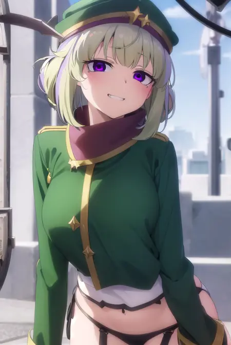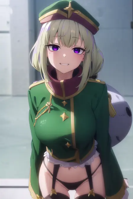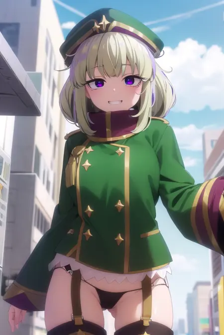 ももひき、ロングスリーブ、帽子、下着、パンツ、ブーツ、手首より長い袖、軍服、黒いパンツ、ガーターストラップ、パンツなし、指先より長い袖、緑の頭部装飾、