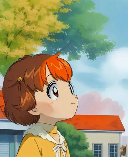 lora:hamtaroByDom83_v10:1, solo, 1girl, Laura, 小女孩, 短发, 棕发, 红色上衣, 短裤, 微笑
