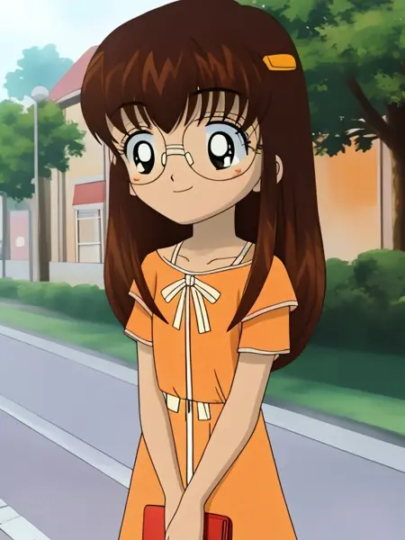 lora:hamtaroByDom83_v10:0.9, 솔로, 1걸, 카나, 어린 소녀, 긴 머리, 안경, 주황색 드레스, 웃는 얼굴