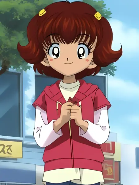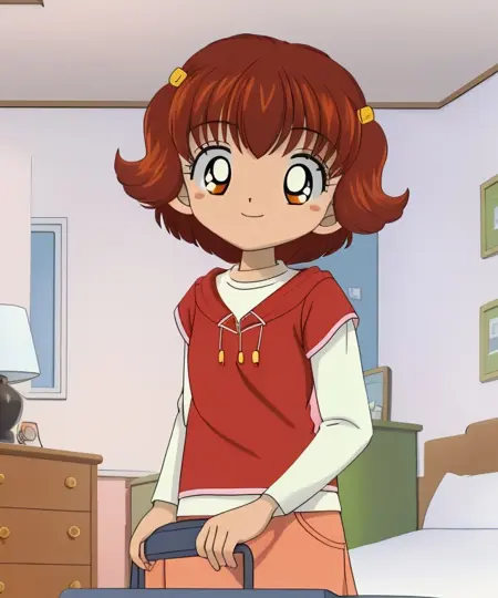 lora:hamtaroByDom83_v10:1, 솔로, 1걸, 라우라, 어린 소녀, 짧은 머리, 갈색 머리, 빨간 셔츠, 짧은 반바지, 웃는 얼굴