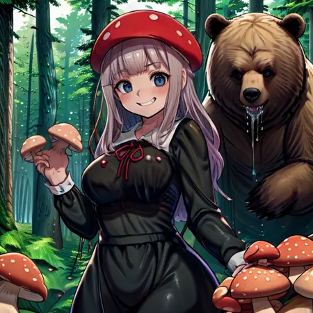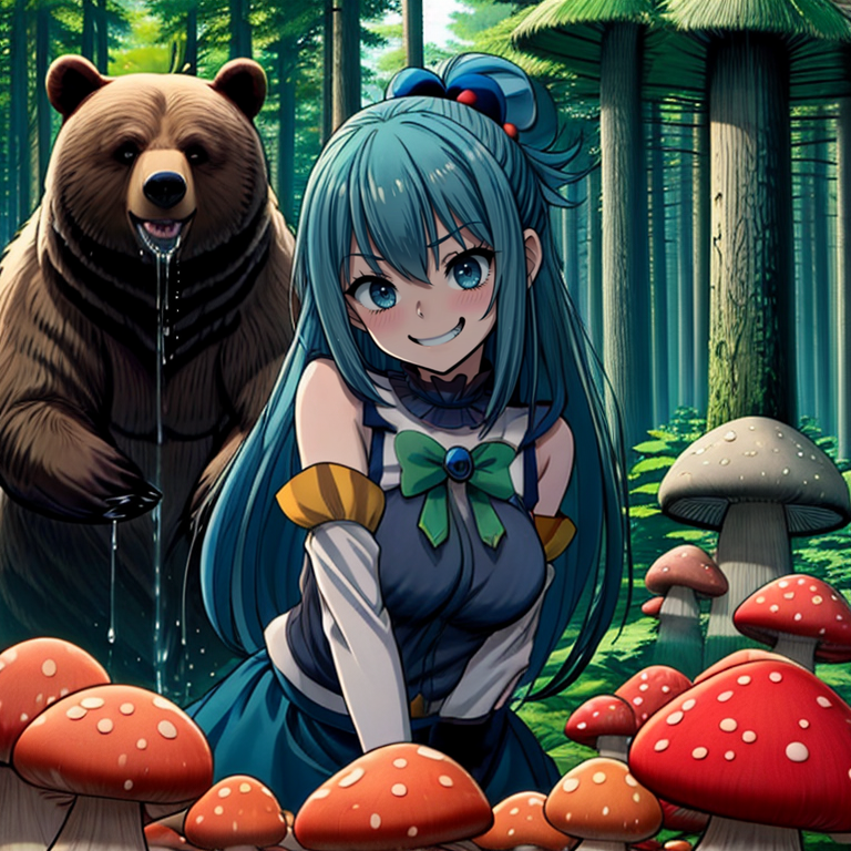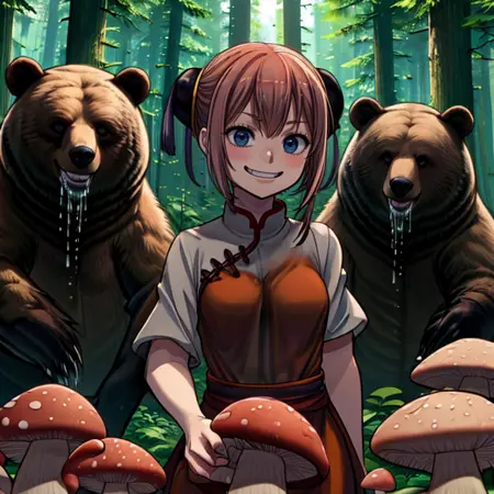 I have LoRa-processed a scene depicting the fate of a mushroom poacher. Successfully rendered a bear drooling behind a specific person, but with stable diffusion, the output strangely includes bear-like ears on the character's head, creating an unnatural image. To rectify this, please use negative prompts to prevent bear ears from appearing in the image.