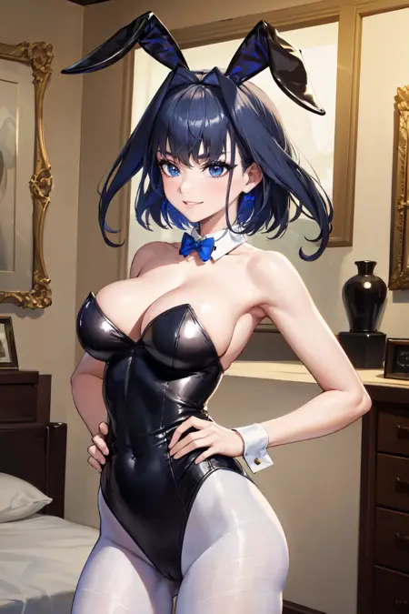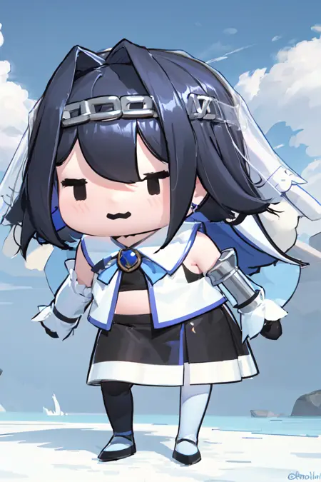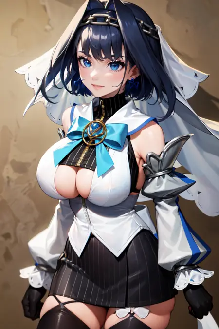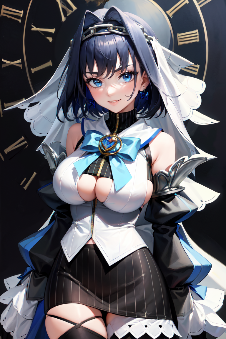 "KroniiBase, short hair, hair intakes, chain, veil, bow earrings, striped crop top, white vest, blue bow, black skirt, detached sleeves, black gloves, black thighhighs"