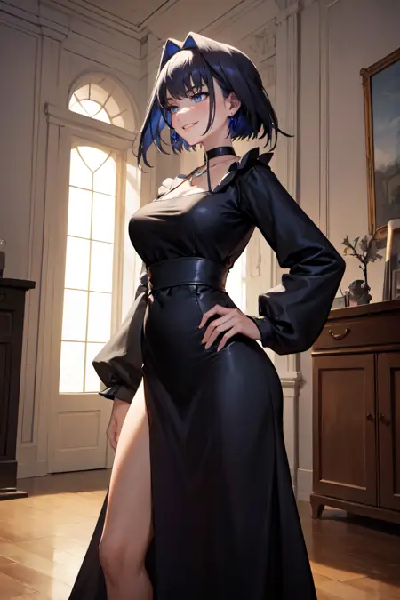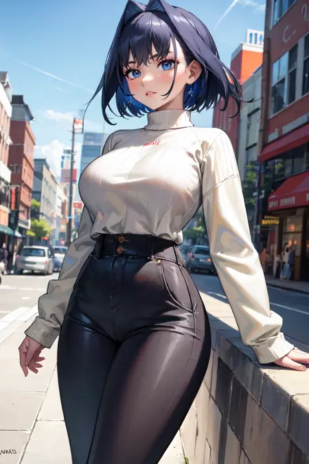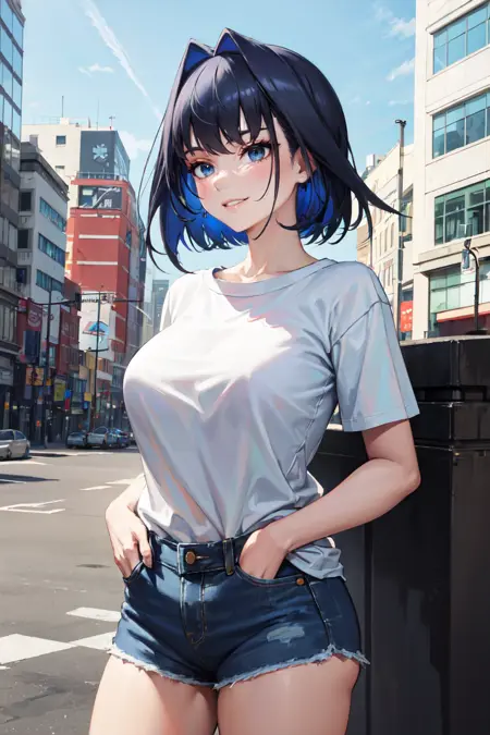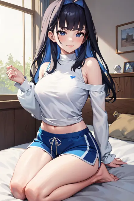 "KroniiCasual, long hair, hair intakes, turtleneck, long sleeves, bare shoulders, (blue shorts)"