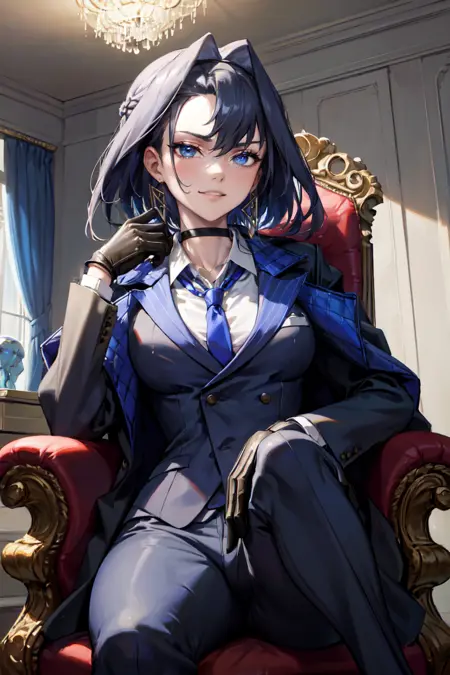 "KroniiMafia, short hair, hair intakes, collared shirt, necktie, formal, suit, gloves, pants, choker"
