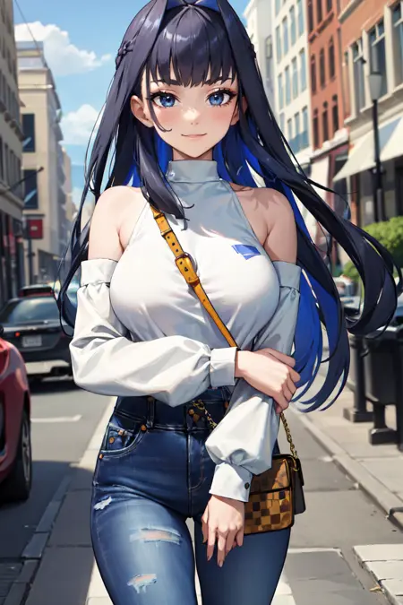 "KroniiCasual, long hair, hair intakes, turtleneck, long sleeves, bare shoulders, jeans"