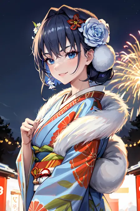 "KroniiNewYears, hair flower, hair bun, blue kimono, floral print, sash, white thighhighs, fur scarf"